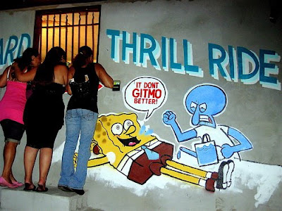 New York artist STEVE POWERS has been working on a torture-themed art project for a while now and in conjunction with CREATIVE TIME as part of its national public art initiative “Democracy in America: The National Campaign,” he’s just opened the Guantanamo Bay-themed “Waterboard Thrill Ride” on Coney Island in the shadow of the legendary Cyclone roller coaster and Nathan’s hot dog stand in an empty storefront on West 12th Street. When a dollar is fed into a machine standing outside Powers’ mock jail cell installation featuring paintings by the artist inside and out, viewers can climb a short flight of steps to peer through cell bars and view an animatronic torture scene of a hooded jailer pouring water down the throat of an orange jumpsuit wearing Gitmo detainee. In creating the exhibit, Powers hopes to use the inherent spectacle of Coney Island to broaden public awareness of and spark debate about a human rights issue that has received minimal weight in the public sphere.Via Supertouch